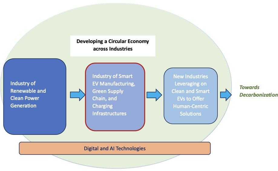 EVs should be evaluated as a synergistic industry to connect renewable energies to decarbonize the transportation sector for a circular and sustainable economy. The development of intelligent EV manufacturing – from design to supply chain to production can create new and advanced jobs under the Industry 5.0 framework.